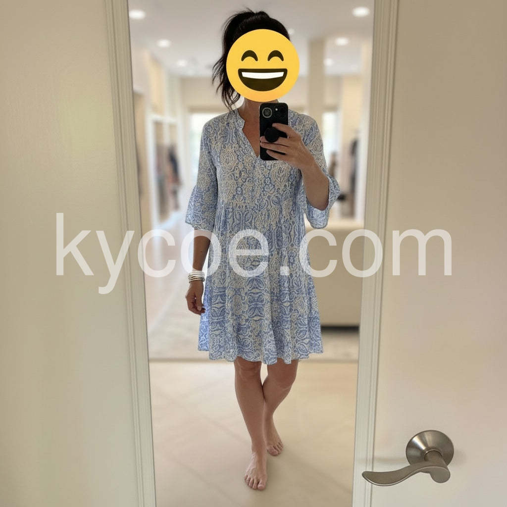 Weathered Blue White Vintage Print Half Sleeve Mini Dress